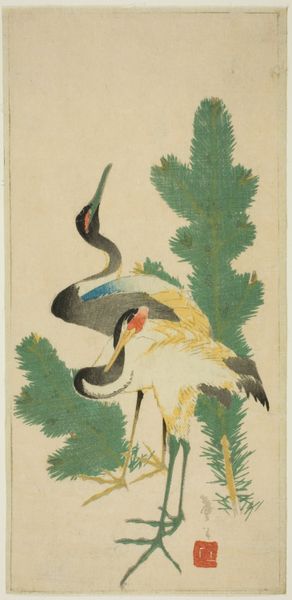 Curator: Ah, look at this remarkable hanging scroll, "Peacock and Flowers," attributed to Nagasawa Rosetsu around 1840. It's one half of a pair of bird-and-flower paintings, done with ink on silk. Editor: My first impression is just pure tranquility. The pastel palette feels so gentle, and that peacock perched amidst the soft pink blossoms looks both regal and utterly peaceful. Curator: Absolutely! It exemplifies Ukiyo-e, that celebrated style of Japanese woodblock prints and paintings focusing on scenes of everyday life and the natural world. Notice the contrast between the intricately detailed peacock plumage and the more subtly rendered blossoms. It's like a poem of textures. Editor: Ukiyo-e also often speaks to notions of a floating world, ephemeral beauty, and maybe even a touch of melancholy knowing things will inevitably fade. Peacocks themselves carry significant symbolism in many cultures – representing beauty, pride, even watchfulness. How do you think that interplay affects our interpretation here? Curator: It adds depth, definitely. Perhaps the peacock is guarding those fragile blooms. Or maybe the artist is meditating on the fleeting nature of beauty itself. To me, there is a subtle element of the artist’s own reflection in this piece; they may also ponder what we see and what may come to be. I also cannot help feeling connected to my ancestral homeland of Japan, which fills me with deep appreciation. Editor: Considering the period it was made, the 1840s, Japan was on the cusp of significant social and political change with the looming end of the Edo period. Do you see echoes of that transition, that potential fragility of a beautiful world on the brink? Curator: It's a potent point. Rosetsu, unfortunately, did not live through the Meiji Restoration. And there's a possibility to see this as a longing for harmony during turbulent times. And given it’s one half of a pair, you have to wonder about the visual conversation between the two, now separated, adding another layer of fragmented meaning. Editor: It's remarkable how such a seemingly simple image can hold so many layers. Curator: Absolutely. It just leaves me with a sense of quiet reflection on life and the gentle strength of the spirit. It just pulls me into the natural world so harmoniously, leaving me inspired to be more mindful of everyday moments.