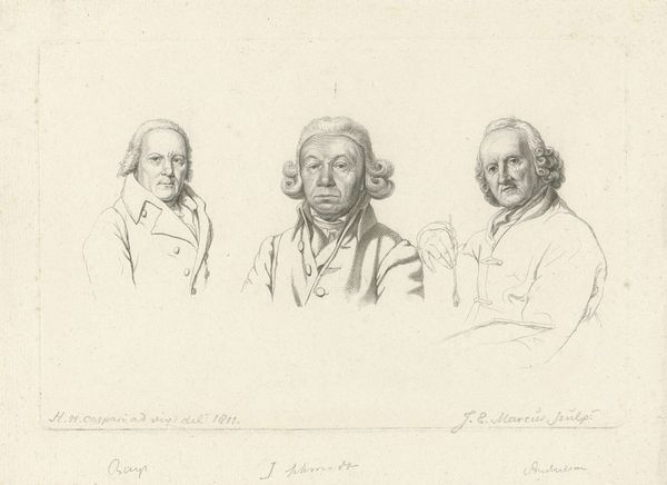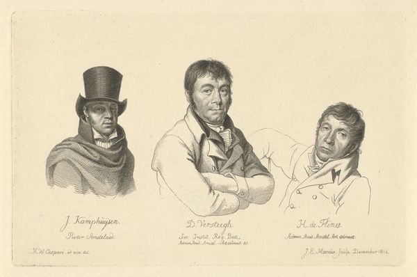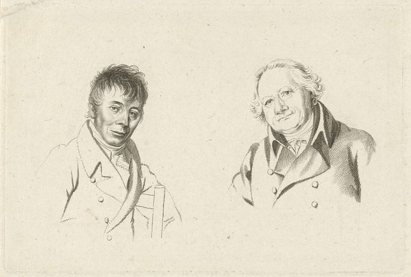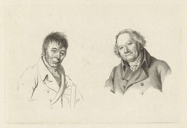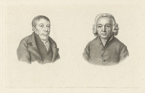 Editor: This is "Portretten van Joannes Wilmet en Johannes Kinker," created by Jacob Ernst Marcus in 1814. It's a print made from an engraving and shows two gentlemen, each in their own little vignette. There is a clear contrast in tone in this work. The figure on the left seems relaxed, while the figure on the right appears more stoic. How do you read these visual choices in this double portrait? Curator: The choice to portray these men through a Neoclassical lens invites us to consider their social standing and the historical context. Do you notice how this print embodies enlightenment ideals through its clarity, balance, and emphasis on reason as seen by each man’s gaze? How might their representation uphold or subvert societal norms of the time? Editor: I do see what you mean with the Neoclassical ideals. I hadn't considered that before. What kind of societal norms would this have been playing into or pushing against? Curator: Consider the role of men of intellect during the Enlightenment, particularly within Dutch society. Were they seen as upholders of tradition or harbingers of change? Think about the French Revolution's ripple effect across Europe. Were Marcus and his subjects—Joannes Wilmet and Johannes Kinker—advocating for reform through these images, or solidifying existing power structures by portraying these individuals with dignity? What social position would be reinforced through this type of aesthetic decision? Editor: That makes sense. The subjects, in their bearing and attire, seem to belong to the privileged class. Curator: Exactly. How does this print then navigate that tension? It appears Marcus immortalized these figures but did he also invite discourse about who is memorialized and why? Do you consider portraiture always an innocent endeavor, or potentially a social practice deeply embedded in historical power structures? Editor: I see how portraits might reinforce specific views and leave others in the shadows. This piece, in that respect, it isn't simply an image of two men, but a window into social structures of its era. Curator: Precisely, and that is how artistic output intersects with the world we inhabit. Reflecting on this portrait, what broader questions about representation and identity does it provoke for you today?