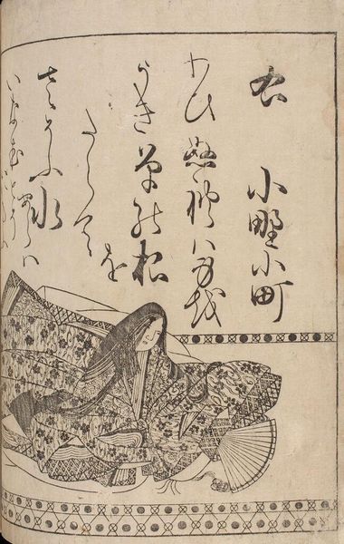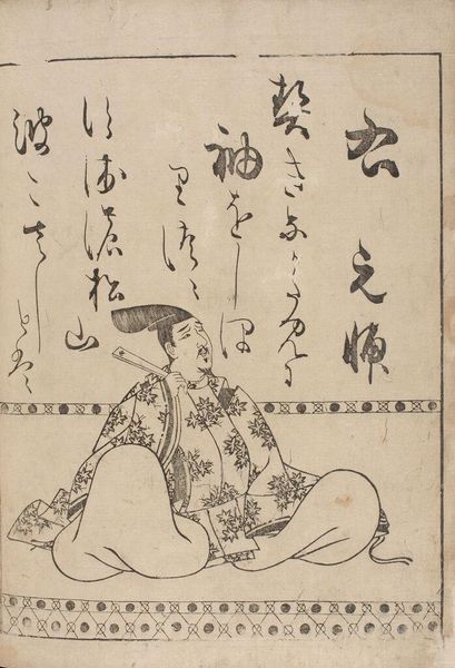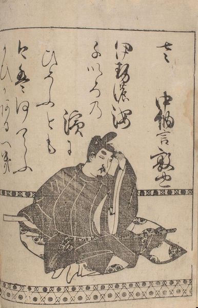 Curator: Hon'ami Koetsu's depiction of "Poet Fujiwara no Toshiyuki," sourced from a printed book showcasing the Thirty-Six Immortal Poets, presents us with a small, intimate glimpse into literary history. Editor: It feels quite serene, almost melancholic. The lines are so delicate, but there's a certain weight in the poet's posture. The calligraphy adds to the sense of reflective contemplation. Curator: Indeed. Koetsu's calligraphy wasn’t just about transcription; it was about capturing the essence of the poet, Toshiyuki. Notice how the curves of the lines mirror the poet's flowing robes, creating a visual harmony. Editor: It’s interesting how social status is conveyed through this simplicity. The careful rendering of his garments speaks volumes about courtly life and its rituals. Curator: Absolutely. The image prompts questions about the role of poets in society, their connection to power, and how their legacy is preserved through art. I wonder, what would Toshiyuki think if he could see himself immortalized in this way? Editor: I think that as cultural preservation, this work inspires us to consider how we honor our history and the individuals who shaped it. Curator: Agreed. It's a potent reminder that art serves as a conduit between past and present, inviting us to engage in a dialogue across time.