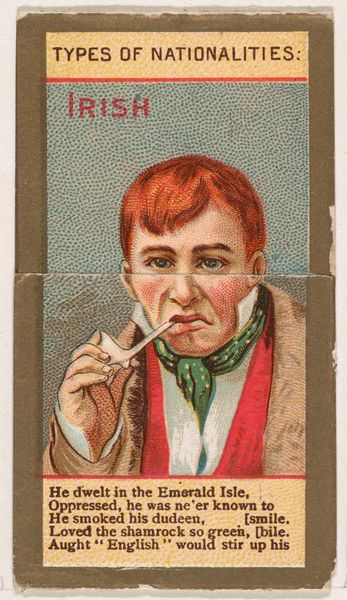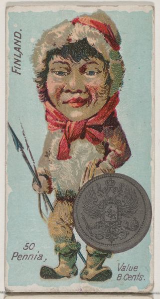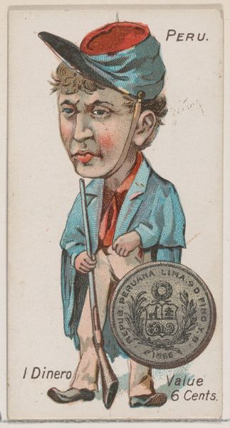 Editor: Here we have "Peru, 1 Dinero" from the series "Coins of All Nations," made around 1889 for Duke brand cigarettes. I’m struck by the caricature style, and how the figure almost seems imposed on top of the coin. What compositional elements do you find most compelling here? Curator: The immediate tension arises from the superimposition of figuration against numismatic representation. The portrait, itself a form of currency given its role in depicting status and power, competes with the literal currency, disrupting a clean semiotic reading. Do you perceive a hierarchy in their placement? Editor: Well, the figure is larger and more colorful. The eye is naturally drawn to him before the coin, which is in grayscale and slightly obscured. Curator: Precisely. Consider also the framing: The rigid edges of the card contain this contrasting imagery. Note the flat planes of color – the pale pink background versus the harsher blues and reds of the figure's clothing. How does that play with the perspectival flattening overall? Editor: It definitely draws attention to the artificiality of the image. The lack of depth almost turns it into a collage. It seems that the Duke company was really interested in grabbing one's attention in this era. Curator: Indeed. And notice how the very flatness emphasizes the *objectness* of the card. The composition therefore calls attention to itself as a constructed, material object. We move away from notions of deep, illusionistic space, and instead acknowledge the pure, surface qualities. Editor: I never thought of it that way, but seeing how all of these different parts add up makes it way more impactful! I was hyper-focused on the man's cartoonish face, but now I can clearly observe what's going on with the overall pictorial balance, between flat color fields and representational image-making.