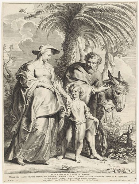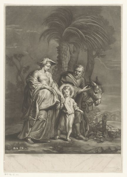Editor: Here we have J. Johnson's "Terugkeer uit Egypte," an engraving from between 1745 and 1794, meaning "Return from Egypt". It's quite a striking piece in its old engraving style. I’m immediately drawn to the composition; the family appears tired, perhaps pensive, and the surrounding landscape suggests a long journey. How would you interpret this work considering its historical context? Curator: The print’s creation coincides with the Enlightenment, a period marked by social upheaval and changing public roles for art. While seemingly a straightforward religious scene, let's not ignore the fact that printmaking makes art more widely accessible. Biblical narratives were hugely popular, acting as both moral instruction and as expressions of shared cultural values. But why do you think Johnson chose to represent this particular moment, the return? Editor: Maybe it has to do with this idea of coming home, the journey, as I mentioned. You said Enlightenment - maybe people related to the difficulties of their journeys? The ordinary public might have seen the Holy Family’s struggles as a reflection of their own lives and hardships? Curator: Exactly! The image subtly reinforces the sanctity of the family unit while perhaps drawing parallels to the viewer’s experiences, especially if many families were enduring displacements during that time. Consider the text beneath the image; a quote from the bible that perhaps speaks directly to their shared faith in dark times. What does the landscape suggest to you? Does it give a certain socio-historical nuance? Editor: It feels a little ambiguous, doesn’t it? The palm tree gives a sense of place, perhaps a promise of safety. It is perhaps too picturesque? Maybe pointing to the landscape itself being under the same public/political scrutiny during this era? Curator: Precisely, the idyllic backdrop is perhaps deliberately placed; it offers an idealised future under their beliefs, subtly prompting the viewers of this artwork to strive towards religiousness in a rapidly secularising Europe. Editor: That makes so much sense! It's fascinating to see how religious art can become a tool for shaping public perception during periods of social transformation. Thanks for showing me that, it changed how I looked at it.