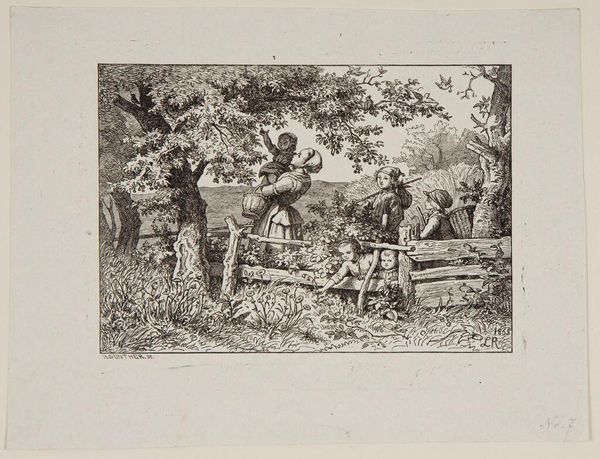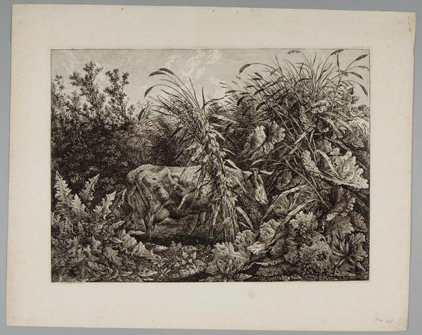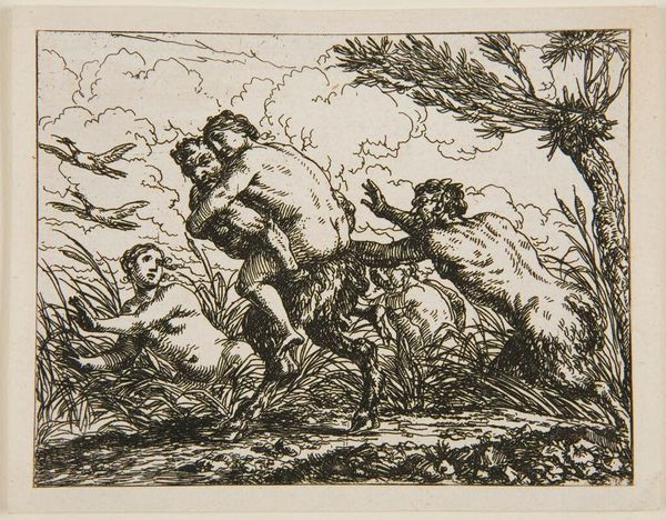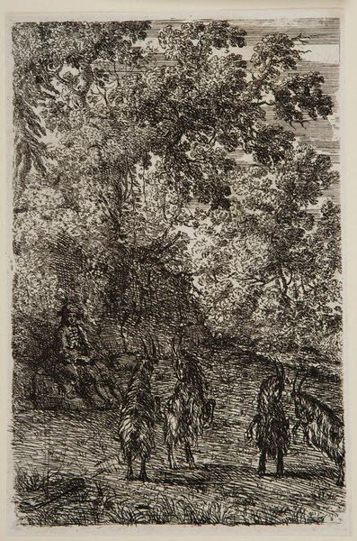Curator: Today, we’re looking at a print by Claude Lorrain, titled "Shepherds and Cattle Crossing a Brook." Editor: Immediately, I get this feeling of pastoral tranquility, like a scene from a forgotten myth. The textures are so rich for a print. Curator: Lorrain often idealized the countryside, reflecting a nostalgia that appealed to the sensibilities of his aristocratic patrons. Etchings like this one democratized access to his vision. Editor: There’s a real contrast here. The wildness of the landscape versus the almost staged placement of the figures. It makes you wonder what their stories are. Curator: It’s a calculated composition, very much in line with the classical tradition, yet it captures a fleeting moment of rural life. Editor: I keep coming back to the light. It feels like it’s about to rain but there's a soft glow trying to break through. It is quite a tender scene. Curator: Indeed, Lorrain understood how to imbue landscapes with emotion, making them more than just pretty scenery. Editor: I think that tension – the real and the ideal – is what makes it sing. It’s a memory of a perfect day that probably never was.