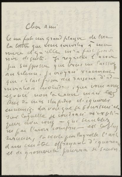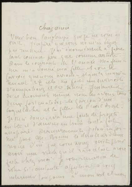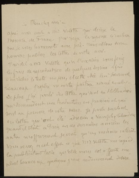 Editor: This is a drawing titled "Brief aan Andries Bonger," made before 1895 by Emile Bernard. It's a letter, really, in ink on paper. I find it surprisingly intimate to see someone's handwriting like this. What strikes you most about this piece? Curator: The intimacy is key. Letters offer a powerful glimpse into personal and intellectual networks. Consider the late 19th century context: Bernard was part of a Parisian avant-garde grappling with modernity. What does it mean that he chose to communicate through a hand-written letter, at a time when industrialization threatened individual expression? Editor: That’s a good point. So the act of handwriting itself becomes almost a statement. I also see a couple words, 'bonheur' and 'felicite'—happiness and delight. Curator: Yes, it appears to be ruminating on ideas of spiritual solace. But I would press you to consider: to whom is he writing, and what social context influenced their discourse? Understanding Andries Bonger is key. He was Van Gogh’s brother's friend. These artists influenced and supported each other deeply. Perhaps the ‘sensations’ he’s talking about is a veiled reference to artistic expression. This may even allude to Bernard struggling with commercialization or finding his personal authenticity, especially regarding suffering, pain, and even happiness, in this search for identity. What if embracing poverty is what creates great art, and creates happiness through this unique suffering. Editor: So reading the letter is a step to opening up all these possible questions and historical threads! Curator: Precisely! Examining such a 'simple' note in the broader historical tapestry and its implications opens so many rich questions. Editor: Thanks, I'll remember this new way of interpreting a letter as more than just a simple message, I really like what I’ve learned today!