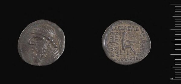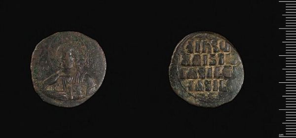 Curator: Here we have a coin of Justin II, a Byzantine Emperor. Look closely; it's more than just currency; it embodies an era of complex social and political dynamics. Editor: It's so worn. You can feel the history just by looking at the patina and the way the details have faded. What materials were typically used for these coins? Curator: Usually, these coins were crafted from bronze, and its production was a carefully controlled process. They were made using die-striking, which ensured consistent imagery for imperial propaganda and identity. Editor: Interesting, it really reflects how a ruler projects their image. On one side, we see the rulers, but the other side seems to show the mark of the city. How interesting to think of it as material evidence of imperial power and identity. Curator: Precisely! And examining its circulation can reveal trade routes, political influences, and even cultural exchanges of the time. Editor: This coin tells us so much about the hands it passed through. Curator: Absolutely, material and image become a testament to its time.