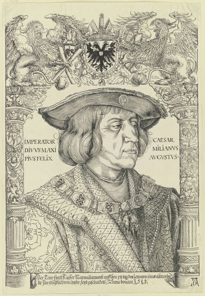 Curator: Here we have a “Copy of Portrait of Charles V” dating from 1485 to 1531, a work attributed to Hans Weiditz the Younger, presently residing at The Metropolitan Museum of Art. It appears to be an old print of some kind. What’s catching your eye? Editor: Initially, I’m struck by the rather formal arrangement of symbols and emblems dominating the space above the figure’s head. They loom over Charles V, conveying a sense of inherited power and dynastic continuity, quite literally overshadowing his presence. Curator: It's executed using a drawing technique—specifically, with pen and ink. Weiditz was quite skilled at utilizing these simple materials to convey intricate detail, emulating a traditional engraving style. Editor: Exactly, there's a weight of historical symbolism present here! Note the crowned shields, the double-headed eagle – instantly recognizable iconography related to the Holy Roman Empire, projecting imperial ambition and legitimacy. Curator: It certainly projects power, and I find it interesting to consider the means of its dissemination. As a print, it could be relatively easily reproduced and distributed, becoming a tool for propagating a carefully constructed image of Charles V throughout his vast territories. Editor: You’re right, and notice the gesture of Charles V's hand holding a golden orb! It's so understated. The symbolism speaks to a sophisticated understanding of how images function as propaganda, as it still manages to subtly project power and authority. Curator: Consider too the physical act of production; the repetitive labor of carving the lines into the woodblock, the access to paper, and ink which at that time would be tied to specific networks of commerce and skill sharing, each of those steps involving artisans, merchants, and networks that enabled such objects to proliferate. Editor: A fascinating point. Looking closer, I’m wondering about the meaning "Noch I I Weiter" appearing at the top; I think it points towards the weight of this historic position. Almost implying that "there are still more to come". Curator: So while we look at this work, a portrait seemingly focused on singular status and rulership, we are also faced with understanding how materials and skill-based production made political self-representation possible. Editor: Indeed. This artwork reveals the interwoven nature of symbolism and politics in crafting identity. Curator: Thank you; the context here provides for a reading of more than the iconic figure suggests.