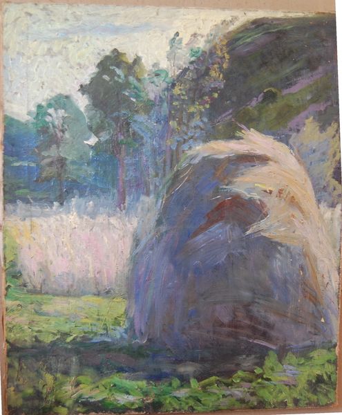 Curator: Standing before us is "Les Grands Rochers dans la forêt", or "The Great Rocks in the Forest," by Léo Gausson. The canvas presents a wooded landscape dominated by geological formations, painted with oil. What's your initial take? Editor: I find the overall tonality quite striking, almost monochromatic. There's a hazy, muted quality to the greens and browns, giving the whole scene a dreamlike atmosphere. It’s very calming but perhaps also a little… oppressive? Curator: The 'oppressive' aspect perhaps hints at some tensions of its historical context. Gausson, a student of Gauguin, found himself working within a Parisian art scene still dominated by the legacy of Impressionism, but seeking new ways forward. The landscape becomes a site to renegotiate those historical currents, particularly the changing role of nature as a subject and the urbanization of France at the time. Editor: Absolutely, but I'm also compelled by the compositional choices here. The artist emphasizes the contrast of texture - the smooth background sky is distinct from the craggy surfaces of the rocks. Also notice the positioning of that one lone tree against the expanse, dividing the canvas vertically and giving it an interesting rhythm. Curator: Indeed. That single tree pulls the eye upwards, further accentuating the natural majesty depicted in this Realist work. One has to consider this interest in the details of the real landscape also corresponded to developments in scientific thinking. The study of geology for instance became of particular interest, informing and lending symbolic depth to these artworks. The rocky forest then represents the past meeting the future, or perhaps, anxieties surrounding the very concept of progress. Editor: And it does this using really fascinating gradations of light. The light doesn’t uniformly strike surfaces, which almost renders those rocks breathing in shadow. This emphasizes both the size and silent power of these giants. It's evocative. Curator: I agree. Viewing it through a contemporary lens, the painting encapsulates both the beauty and perhaps the underlying tension between humanity and the natural world at a pivotal point in history. Editor: And I see it too as an engagement in light and volume. Both our historical and artistic understandings allow us to consider this work in deeper ways.