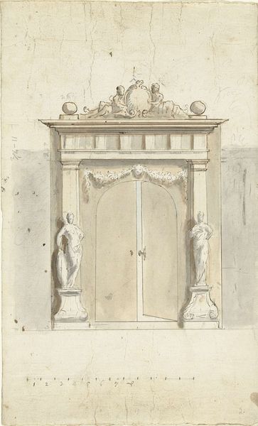 Editor: Here we have "Design for Part of a Wall Elevation with a Balcony flanking an Arch" by Faustino Trebbi, dating between 1761 and 1836. It appears to be a watercolor and ink drawing of an architectural element. I’m struck by how the artist uses shadow to create depth and give the impression that we are looking at an actual space. What compositional elements stand out to you? Curator: The initial aspect that draws my attention is the orchestration of lines and forms. The precision of the drafted lines create the framework upon which the more ornamental details hang. Examine the fluted pilasters, how the verticality is emphasized to create a sense of ordered space, while the ornate capitals introduce contrast in texture. What relationship do you perceive between the structural and the decorative? Editor: I see what you mean about the contrast. It’s like a grid supporting the more free-flowing elements like the floral arrangement and the garland details. Does the archway at the top act as a way to visually resolve those two approaches? Curator: Indeed. Observe how the curve of the arch echoes in the floral arrangement below, establishing a visual link between the upper and lower registers of the composition. Consider, too, the effect of light and shadow: areas are selectively darkened or lightened to emphasize three-dimensionality and suggest material presence. Note the flat applications of color. Do you find them successful or slightly at odds with the overall precision of the piece? Editor: I can see how the flat wash of color might detract from the detailed line work. Maybe it’s meant to emphasize the overall shape instead of getting lost in the details? I do appreciate the interplay of lines and tonal variation now that you point it out! Curator: Precisely! Formal analysis encourages this very focused attention on elements such as line, color, form, and their interrelationships to uncover meaning. Every detail is interconnected!