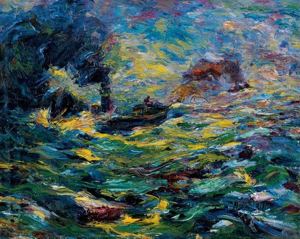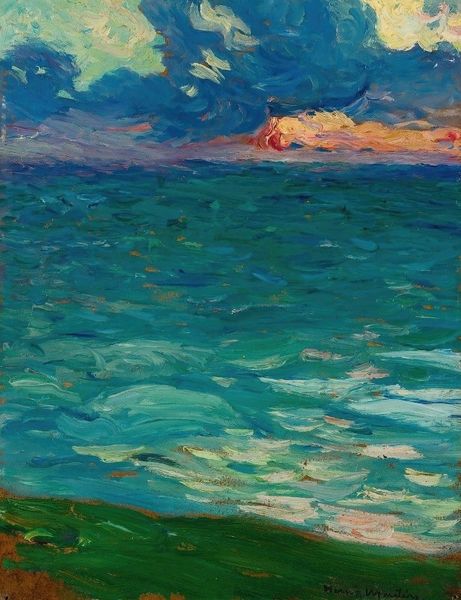 Curator: Oh, this piece has a very somber, contemplative feel to it. The colors are muted, almost melancholic. Editor: Let's delve into that a bit. This is Maxime Maufra’s “Sunset on the Sea,” created around 1910. Maufra was deeply involved in the Post-Impressionist movement, so already we can surmise that, beyond simply representing what he saw, he’s also trying to give us his *interpretation* of the sea and sky, an interpretation filtered through a specific set of formal concerns. Curator: You can really see that handling of oil paint; thick impasto laid down in broad strokes, very textural. What type of brush work do you suppose went into this artwork? It certainly isn't the type produced in an atelier. Did the artist use commercially-produced paints or grind and mix their own pigments? These details are essential. Editor: Knowing Maufra worked often *en plein air,* paints premixed at his disposal, offers insights into his choices, too. Consider how capturing a fleeting sunset necessitates rapid execution. Think about the culture of outdoor painting at the turn of the century— the logistics, the easels, the very idea of "capturing" nature becoming increasingly important through these artistic societies and exhibitions! It certainly influences our understanding of pieces like this, created by the artist on location. Curator: The brushstrokes create such an expressive surface. See how he used layers, each working towards a representation of atmospheric effects. I wonder about the socioeconomic factors at play – how advancements in paint technology, easily accessible and packaged paints allowed artists more liberty with working outdoors, versus previous production chains needed for more elaborate and less affordable paint production of past eras? Editor: Yes, and this was a time when coastal landscapes were becoming increasingly popular subjects, both in art and popular culture. Think of the rise of seaside tourism. Depictions of nature provided city-dwellers an idealized vision of leisure and escape. So what do we see reflected back to us through an artwork like this? Certainly nostalgia for what feels untainted, "natural." Curator: I wonder if it offers any connection, or critique, to the burgeoning coastal development industry of the era and materials it might have employed. Editor: It's a powerful contrast – that romanticism paired with that silent anxiety underlying modern life. It urges one to reconsider their interactions, at that moment, with society. Curator: I think it certainly is a conversation starter, revealing just as much about ourselves as viewers now as it may reveal about the artist at the time of its creation. Editor: I completely agree; the conversation continues, across the century that separates us.
