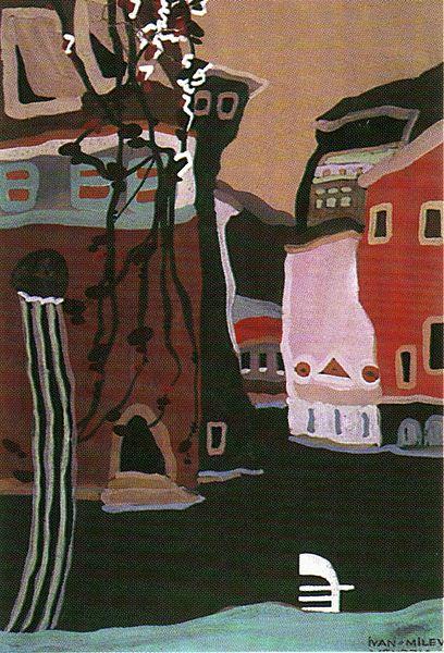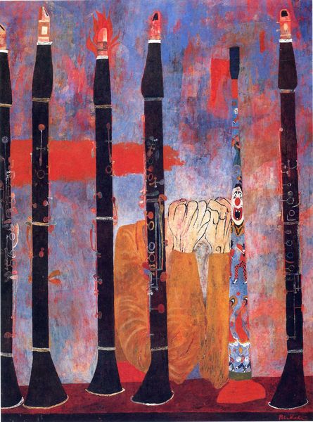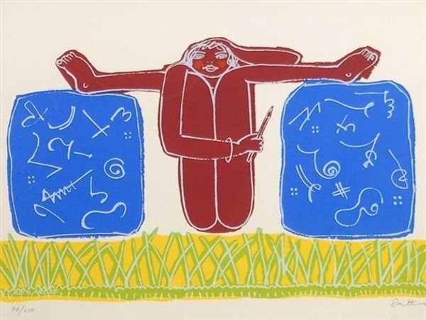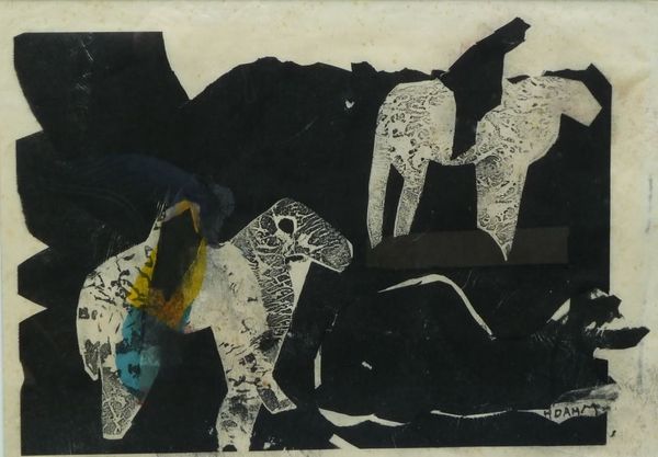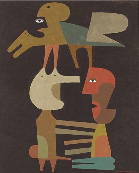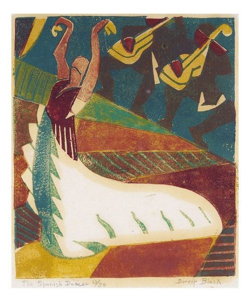 Curator: Azechi Umetarô’s woodcut print, “Parting,” now in the Harvard Art Museums, strikes me as quite melancholic, even lonely, with its sparse setting and isolated figures. Editor: It's fascinating how Azechi, using woodblock printing—a technique deeply rooted in craft traditions—depicts this scene. The process itself involves labor, from carving the wood to applying the ink. Curator: Absolutely, and we can see how the social context of postwar Japan might influence such a stark depiction. The figure’s backpack and raised hands—perhaps a traveler or refugee—echo the era's anxieties. Editor: Indeed, consider the materiality: the texture of the paper, the ink's density, all contributing to the print's overall impact as a manufactured object meant for consumption. Curator: The simplified forms and limited color palette, though, almost create a fable-like quality, reflecting the public role of art as both commentary and potential solace. Editor: Yes, the composition draws our eye, guiding how we perceive these figures in relation to the landscape—a calculated strategy to engage the viewer. Curator: Ultimately, "Parting" reveals the power of art to capture a moment in history while also resonating with universal human experiences. Editor: And through its very production, it reminds us of the intersection of artistic labor and cultural exchange.