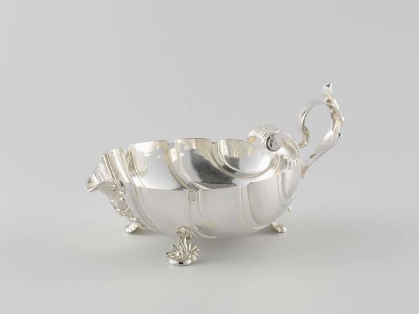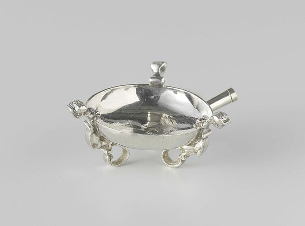 This is a Tabakskomfoor, or tobacco stove, made by Arnoldus van Geffen in the 18th century from silver. The glossy, light-reflecting surface of the silver is carefully wrought into a bowl-like shape, supported by three delicate legs. A short pipe extends from the side, an opening for lighting. Silver is a precious material that signifies wealth and status, a popular choice for luxury items like this one. To make this piece, the silversmith would have used a combination of techniques, including hammering, casting, and soldering. Each of these steps requires skill and precision, and the marks of handcraft are evident in the object's details. This contrasts with the mass-produced goods emerging at the time, making it a display of artisanal production, labor, and cultural value. Looking closely at the piece allows us to appreciate the artistry involved, reminding us that even everyday objects can be carriers of cultural meaning and social significance.