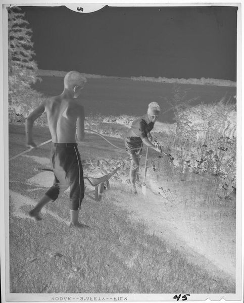 Editor: This small black and white photograph, simply titled "Untitled (little boy wading in water)," by Lucian and Mary Brown, captures a child in water. It feels so personal, almost like a memory. What kind of stories do you think this image is trying to tell? Curator: The image evokes the archetype of innocence and play, doesn't it? The water, a universal symbol of the subconscious and cleansing, frames the boy's wading as a baptism of sorts, an entry into experience. Editor: Baptism? That's a strong word for just a kid playing in water. Curator: Think about the cultural weight of water. It's life-giving, but also a force of chaos. The boy's vulnerability, emphasized by the negative exposure, is not just a portrait, but a reflection on the precariousness of childhood itself. Editor: I never thought of it that way. It's less a snapshot and more of a cultural echo. Curator: Precisely. It invites us to consider how we project our collective anxieties and hopes onto the image of a child.