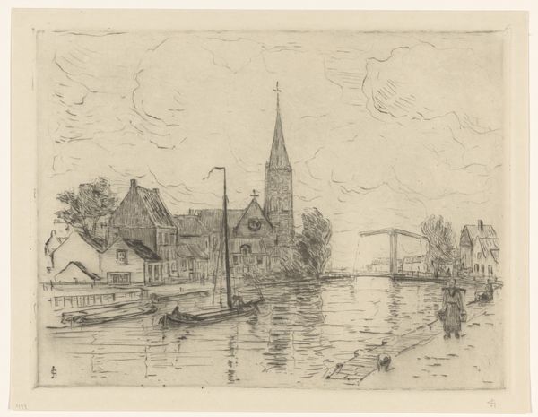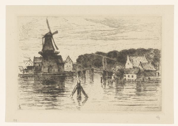 Philip Zilcken created this artwork, Landschap met huizen en molen aan het water, an etching on paper. The composition invites a contemplative gaze, primarily rendered in muted tones that give the scene a tranquil, almost melancholic air. Notice how Zilcken uses fine lines to define the forms of the buildings, the windmill in the distance, and the gentle ripples on the water's surface. The scene unfolds with a serene linearity, as the buildings and windmill are horizontally placed. The artist employs a structural clarity, yet, there is a sense of fluidity, as the reflections in the water blur the boundary between the tangible and the ethereal. Zilcken captures the landscape’s inherent structure while highlighting the transient effects of light and atmosphere. Consider how the semiotic elements, like the windmill, often symbolize progress and industry, are here softened, almost fading into the misty background. This etching does not merely depict a landscape; it engages with the very act of seeing and interpreting.