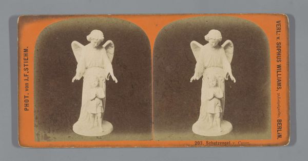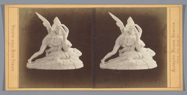 Editor: This photograph depicts Tadolini's sculpture of Eros and Psyche from around 1860-1880. There's a striking tension between their embrace and the almost rigid formality of the Neoclassical style. What layers of meaning do you see in it? Curator: The Neoclassical embrace of Greco-Roman themes here, particularly Eros and Psyche, idealizes a romantic love, a popular subject. However, seen through a contemporary lens, the sculpture can spark discussion on the idealization of beauty standards, specifically within Western art history. Do you think the depiction reinforces or challenges these norms? Editor: I suppose the sculpture could be interpreted either way, depending on the viewer's perspective. But it does remind me of how pervasive the male gaze has been throughout art history. Curator: Precisely! Think about how the story of Eros and Psyche has been used and adapted over time. The myth, often seen as an allegory of the soul's journey towards love and understanding, can also be unpacked regarding power dynamics and consent. Psyche's journey, while ultimately triumphant, begins with obedience and a lack of agency. Editor: That's a great point. Considering its creation during a time of significant social change, does that suggest a commentary on those shifting societal roles and power dynamics? Curator: Possibly, although interpreting intention across time is tricky. However, analyzing the sculpture's composition, its embrace of Neoclassicism during a period of burgeoning Romanticism, presents opportunities to consider the artist's commentary on artistic and societal conventions. Editor: I hadn’t thought of it that way. It's amazing how one piece can speak to both its own time and to contemporary concerns. Curator: Absolutely! And thinking about it within broader, intersectional narratives can open even richer understandings. Editor: I definitely learned to look at it in a completely new way. Thanks for sharing that perspective.
