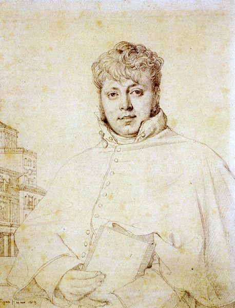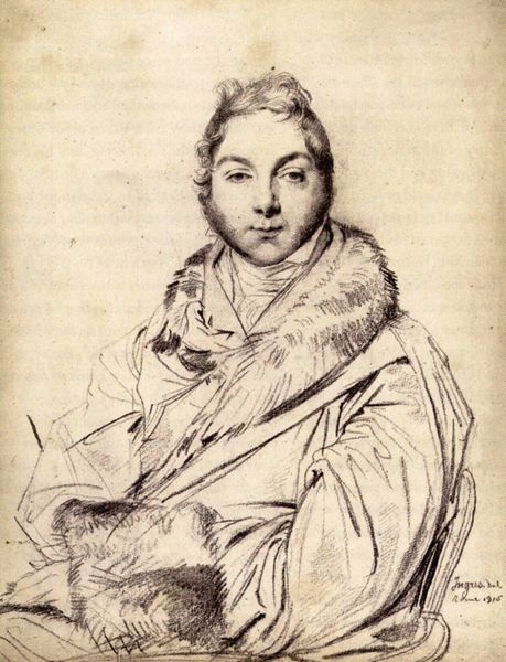 Jean Auguste Dominique Ingres created this pencil drawing of Victor Dourlen in Rome, around 1808. Ingres's portraits were typically commissioned by the bourgeoisie, reflecting the sitter's social status and personal identity within the rigid social structures of the time. Here, Dourlen is depicted with a soft expression, his curly hair framing his face, looking almost vulnerable. This sensitive portrayal invites a dialogue between traditional masculine representation and a more nuanced, emotional expression. The backdrop of Rome, combined with the inscription referring to the Villa Medici, speaks to the cultural aspirations of the French elite. Ingres’s work navigates personal sentiment and societal expectations while subtly challenging the formal conventions of portraiture. This portrait captures a moment in time but also poses questions about identity and representation.