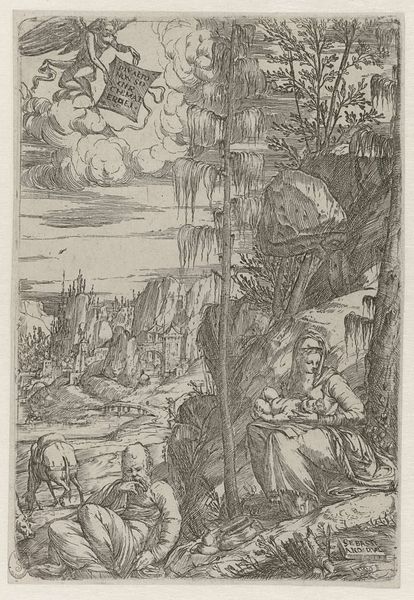 Editor: Zoan Andrea’s “Saint Jerome in Penitence” is striking! The detail in the landscape and Jerome’s muscular physique create a powerful image. How do you interpret this work? Curator: Well, it’s interesting to consider how this print participates in a visual culture that celebrated religious figures. The rocky landscape and Jerome's isolation emphasize his devotion, but also the power structures of the Church itself. Notice the lion; how does its presence reshape our understanding of Jerome's authority? Editor: So, the lion isn't just a symbol of his holiness, but also a reflection of the Church's influence? Curator: Precisely! And think about who might have purchased this print. It offered a readily available image of piety sanctioned by the Church. Editor: That’s a different perspective than I had initially. Thanks!
