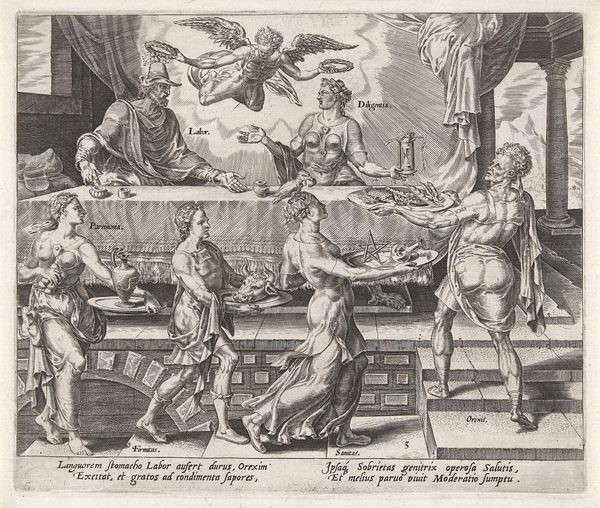 Philips Galle made this engraving, Labour and Diligence Enjoying Their Simple Meal, in the Netherlands, sometime around 1600. The image depicts an allegorical feast of labor, diligence, sobriety and moderation. Here, the artist uses classical imagery to comment on the value of a simple life. Galle was the head of a printmaking workshop, and he was deeply involved in the artistic institutions of his time. His prints reflect the cultural values of the Northern Renaissance, praising hard work and temperance. This print encapsulates those values, drawing on a rich history of classical and biblical imagery to convey a moral message. To understand this artwork, it's helpful to delve into the culture of the time, to research the history of printmaking, the lives of artists, and the role of workshops in artistic production. By exploring these resources, we can gain a deeper appreciation for this seemingly simple image and its place in history.