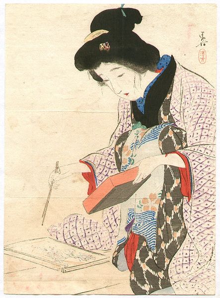 Editor: Here we have an untitled painting by Uemura Shoen. The style is reminiscent of Ukiyo-e with its delicate lines and intimate portrayal of a female figure. What stands out to me is the sitter's contemplative mood; what do you read in this image? Curator: Indeed. Notice how the artist presents a woman in what seems to be an act of refined creation, poised with a brush in hand. Her serene posture, combined with the delicate patterns of her kimono, evokes not just individual action but recalls centuries of artistic tradition and cultural expectations for women. What continuities can we draw, connecting this intimate moment of creation to wider historical themes and female expression in art? Editor: It’s interesting to consider what she might be writing. The composition directs our eyes to her hand and the paper, making us question what story she wants to tell. Could this be a subversive piece, subtly hinting at the limitations imposed on women’s self-expression? Curator: An excellent point! Is this depiction merely of traditional womanhood or an encoding of longing for creative voice and cultural impact? Think about the weight of representing inner worlds during a time when overt expressions of female ambition were constrained. It asks: How much can be said through gesture and symbol when direct expression is limited? Editor: That reframes everything, providing a powerful understanding of what images can communicate beyond what we immediately see. This has completely changed my interpretation of the piece, moving past the superficial beauty to understanding a far more significant story. Curator: And that story echoes far beyond the image itself, don't you think?