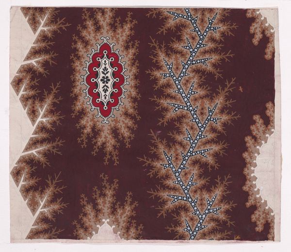 These designs for printed cotton textiles, undated and by an anonymous artist, present a fascinating study in pattern and form. The designs immediately draw you in with their rich, earthy palette of deep browns, reds, and creams, creating a warm yet complex visual texture. The composition is structured around a prominent paisley motif alongside a vertical arrangement of floral ovals, both set against a field of fractal-like patterns. These branching patterns, reminiscent of organic growth, introduce a dynamic tension between the structured motifs and the unbounded background. The artist employs a semiotic language here, where the paisley, traditionally a symbol of life and eternity, is recontextualized within a field suggesting endless expansion and dispersal. The strategic use of negative space, particularly around the edges, allows the patterns to breathe, preventing the design from becoming overwhelming. This piece invites us to consider how patterns function not merely as decoration, but as complex arrangements of signs that reflect broader cultural and philosophical engagements with themes of life, growth, and infinity.