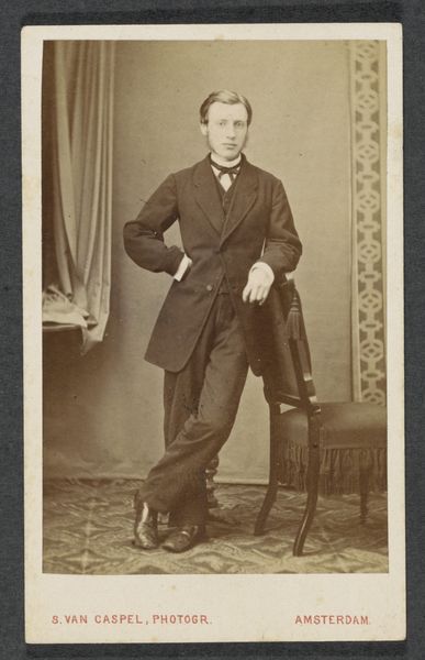 Editor: We're looking at "Portret van Karel Hendrik van Brederode," a gelatin-silver print photograph from sometime between 1858 and 1866, made by Polman & Hohmann. It has that classic 19th-century feel, with the gentleman leaning nonchalantly. What draws your eye when you look at this portrait? Curator: Oh, the delicate dance between formality and ease! It feels so staged, and yet… I wonder what was going through his mind in that captured instance. Notice the subtle fall of light on his face. The way it both reveals and conceals? Almost like he’s letting us in on a secret… a secret only known in sepia tones. It's romantic isn’t it? Editor: I hadn't thought about it like that, a kind of visual secret! So you think it's romantic rather than… stuffy? Curator: Stuffy implies a rigidity I don’t quite see here. I think what reads as formality to our contemporary eyes was simply *the* way one presented oneself in that era. The slight tilt of the hat, the chain dangling, these are little rebellions against that very stuffiness. Almost as if he’s saying, “Yes, I’m proper… but with a wink." Do you sense that push and pull? Editor: I can definitely see the wink now. That makes me think differently about the context, too, about photography still being a relatively new medium. Curator: Precisely. And to commission or sit for such a portrait, it was no small affair. Perhaps that explains that hint of both pride and self-awareness in his eyes? Maybe, he saw photography as something else as a way to capture history? Editor: It's amazing how much information you can glean from what I originally perceived as just a posed photo. Thanks for opening my eyes! Curator: My pleasure! It is these layered histories and subtle artistic decisions which truly makes these portraits magical, wouldn't you agree?