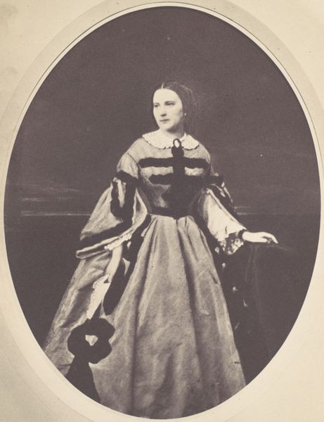Curator: David Octavius Hill created this arresting image, "Mrs. Rigby," around 1845. What's your initial take on it? Editor: The somber tones immediately struck me. It has an almost painterly quality, reminding me of lithographs from the same era. I am interested in the materiality that conveys her somber mood. Curator: Exactly! It's a fascinating example of early photographic techniques and speaks volumes about Victorian society’s constructions around gender and aging. I’m drawn to her assertive gaze, quite unusual for women's portraits then. Editor: It certainly begs the question: who *was* Mrs. Rigby? This calotype printing process was new, but resource-intensive. Was she of elevated status, one wonders, afforded access to emerging technology and perhaps patronage networks? The delicate lace on her cap is an interesting class signifier as well. Curator: Precisely! Understanding access to emerging technologies during this period allows us to dissect those patronage networks, reflecting how gender and class intersect. Moreover, the choice of attire reflects how women strategically used material objects for self-expression within restricted Victorian norms. Her almost defiant posture can be seen as subversive given those confines. Editor: Looking closely, I see the way light interacts with the fabric. How much manipulation was required to capture this detail? Those choices reveal not just artistic intent, but also the limitations – and potential – of this cumbersome early photographic method. I want to get my hands on the original! Curator: I think understanding Mrs. Rigby and photographic innovations enriches our appreciation for representations of women throughout history. These aren't passive objects; they actively shaped and challenged Victorian expectations. Editor: And in the end, by reflecting on the laborious, often collaborative effort embedded within it, "Mrs. Rigby" invites us to consider both the object and the system in which art and identity are constructed. Curator: Agreed. These types of images provide critical narratives that resist traditional male perspectives prevalent in history books. We might think about who doesn't have access. Editor: True. Materially grounded inquiries can transform static assumptions into productive avenues of inquiry, bridging history, identity, and visual culture.