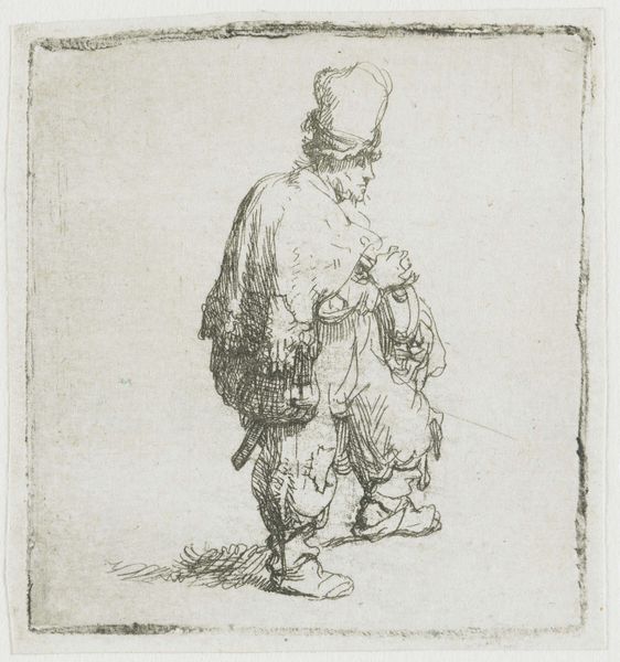 Curator: Let's turn our attention to this etching by Rembrandt van Rijn, created around 1629. It's titled "Old Man Seen from Behind, Profile Right: Half-Figure." You'll find it here at The Art Institute of Chicago. Editor: The first thing that strikes me is the textures—the frenetic energy in the lines used to render his cloak contrasted with the finer lines depicting his shirt. The roughness creates a certain immediate and arresting presence. Curator: It's fascinating how Rembrandt uses such simple materials, ink on paper, to create a psychologically rich portrait. The old man, seemingly unaware of being observed, evokes questions around age, poverty, and even a certain resignation to social injustices of the time. How do we reckon with representing a population on the margins? Editor: Exactly. Look at the details: The torn sleeve suggests wear, labor. The quick strokes used to depict the garment show it wasn't finely made, yet it cloaks this subject who could have made it. Also the technique is so very intriguing; the dense cross-hatching builds volume while also giving this whole work a sense of impermanence. One stroke here or there is a world of difference. Curator: It's also tempting to read the feathered cap as a signifier of identity and perhaps even status—or rather, a performative status, in that it plays with ideas of authority and hierarchy, especially during that particular period in the Netherlands, reflecting issues of power, gender, and marginality. How does this "outsider" figure into that society's social structure? Is this a portrait of defiance? A portrayal of societal failing? Editor: Possibly. He holds onto tattered clothes. The ink seems almost violently dragged across the plate to form his form—labor to depict labor or a call for care towards it. Rembrandt clearly wants us to *see* him and through what’s readily and presently surrounding him. It underscores his position outside conventional beauty or power. Curator: This piece serves as a powerful reminder of how art can engage with societal concerns, questioning preconceived notions and sparking dialogue. I am struck by the image and context and my personal placement in the conversation with them. Editor: For me, it’s about understanding Rembrandt’s technical processes. I understand the work more with the knowledge of labor.