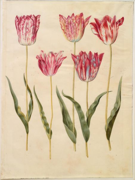 Hans Simon Holtzbecker created this botanical study of tulips on paper sometime in the 17th century. The medium itself speaks to the artist’s intent. This isn't a painting on canvas intended to emulate reality. It's an observation, an objective record using accessible materials like paper, inks, and watercolors. The smooth surface of the paper contrasts with the delicate brushwork, allowing Holtzbecker to capture the subtle gradations of color in the petals and leaves. But beyond mere description, the artwork is imbued with the cultural significance of the tulip itself. During the 17th century, tulips were a luxury commodity, and this piece reflects the immense value placed on these imported flowers. The rendering of these exotic blooms, down to the roots of the bulb, suggests a desire to master nature through careful study. Holtzbecker's rendering transforms a simple flower into a potent symbol of wealth, status, and the burgeoning world of global trade.