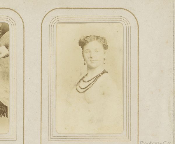 Editor: We’re looking at a photograph from the late 19th century, titled "Portret van een jonge vrouw," or "Portrait of a Young Woman," by Charles Reutlinger. The sepia tone gives it a nostalgic feel, and the subject has quite an enigmatic expression. What stands out to you? Curator: The enduring gaze speaks volumes, doesn’t it? Think about the symbolic weight of portraiture in this period. It's not merely representation; it's about constructing and preserving an image, a memory. Note the necklace and earrings - can you interpret the significance they may carry? Editor: I suppose they denote status? Wealth? Curator: Indeed. Consider the cultural values embedded within them – beauty, societal position, but perhaps also a carefully curated identity. Photography offered a new medium for solidifying these symbols. Her slightly turned head reminds me of classical sculpture. Editor: That's a fascinating connection. So, we are viewing her almost as an icon? Curator: Precisely. Every detail - the ornate border around the photo itself, the classical allusion in her pose - contributes to this construction of an image meant to resonate through time. Reutlinger presents an ideal, a cultural memory preserved in light and chemicals. Editor: It's incredible how much meaning can be packed into a single image, even something that initially seems like a simple portrait. Curator: Exactly! It's about recognizing the symbols and the visual language that shapes our understanding of the past, and ourselves. This helps us interpret continuity between past and present.