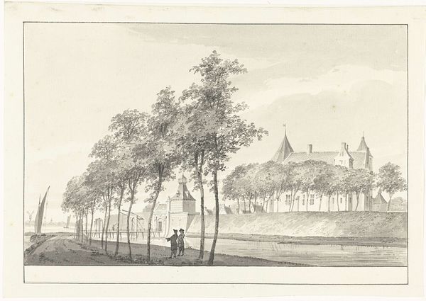 Curator: Right now, we’re looking at “Gezicht in een Duits stadje,” or "View of a German Town," a pen and pencil drawing made around 1861 by Pieter van Loon. It’s currently held at the Rijksmuseum. Editor: Immediately, I get a sense of looking through a very sophisticated traveler's sketchbook. It's like finding a beautifully rendered memory, all in monochrome, tinged with melancholy. Curator: That's insightful. The cityscape itself presents familiar architectural symbols – the church spire, the gabled houses – archetypes that point to shared cultural spaces and their established social hierarchies. The slightly aged quality evokes nostalgia. Editor: Precisely! And there's this very personal quality, probably the mark of light pencil work; it's almost as if he's inviting us to recall a collective past. A past filled with market squares and the steady, yet antiquated, rhythm of horse-drawn carts. It stirs something, a connection to lives lived centuries ago. Curator: Absolutely. The composition subtly directs our gaze to those central buildings and suggests communal activities and interactions. And if you see closely at how detailed they were able to render even small objects like horses— Editor: True, but the pen work has an intentionally unfinished quality, hasn’t it? Leaving us room to fill in details, perhaps project our own longing onto it, adding personal resonance to a timeless urban view. Almost like… an illustrated haiku? Curator: I agree; it definitely functions as an evocation, more than a documentary record. By utilizing accessible symbolism, even the contemporary viewer may grasp sentiments within a recognizable, Romantic frame. The architectural symbols are recognizable in this context and time—it would be as evocative then as it is for us. Editor: I'll say—this humble sketch offers far more than just a 'view'. It shows the persistent power of visual fragments, connecting distant cultures and echoing inner yearnings. Curator: Yes. It underscores the capacity of an image to convey far more than a mere record, triggering responses that ripple across time and individual experiences. Editor: I walk away seeing that Pieter's town has unlocked something in me too—a fondness for forgotten times!