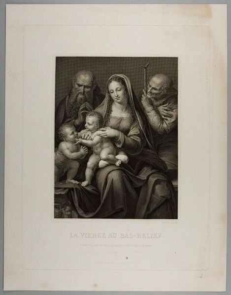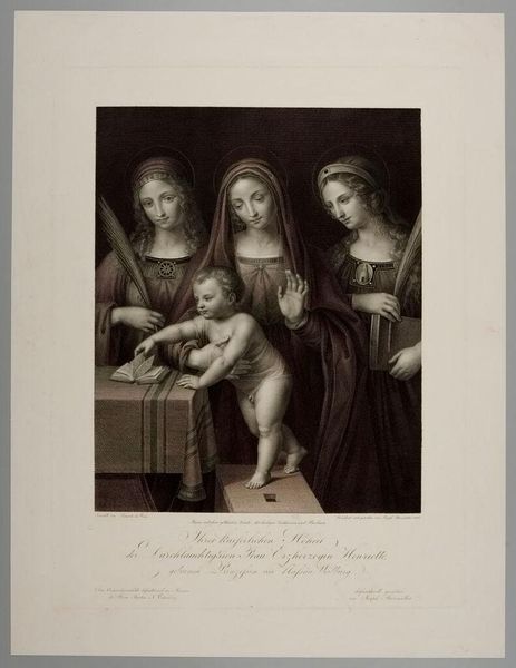 Curator: This is Johann Gotthard Müller's "The Holy Catherine," housed right here at the Harvard Art Museums. Editor: It has a pensive air, doesn't it? The soft shading around her eyes and the way she's absorbed in the book... almost melancholy. Curator: Absolutely. Catherine's book links to her historical role, often associated with learning and philosophy, a patron saint for knowledge. Müller was a pivotal figure in disseminating classical aesthetics through prints. Editor: The angels almost seem to be peeking over her shoulder, mischievous yet reverent. Are they symbols of divine inspiration? Curator: Possibly. They reflect the broader cultural fascination with angelic figures. This piece underscores art's role in shaping and circulating religious iconography. Editor: The circular halo above Saint Catherine almost looks like a crown. It's fascinating how these symbols subtly shift our understanding of power and divinity. Curator: Indeed, its enduring power speaks volumes about our need for icons that reflect evolving cultural values. Editor: Reflecting on this, I'm struck by the layers of meaning embedded within such seemingly simple imagery. Curator: Quite right, and its historical journey only adds to its complex appeal.