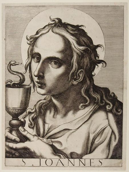 Curator: This is Nicolas Ryckemans's "Saint John." Look at the way he holds the chalice. Editor: He looks contemplative, almost melancholy. The dark background really throws his face into sharp relief, doesn't it? Curator: Indeed. The chalice, of course, is a classic symbol of Saint John, referencing the legend of the poisoned cup. Ryckemans situates John within a tradition of sacred iconography, yet... Editor: There's something almost theatrical about his posture. Like he’s about to deliver a monologue, right before something big happens. Curator: Perhaps Ryckemans means to connect the suffering of Saint John to broader issues of faith and persecution during his time. Editor: It’s interesting to consider how artists use familiar narratives to touch something deeper within us. Curator: Precisely. Art, in that sense, becomes a mirror reflecting our own struggles. Editor: Well, that's a thought to sit with for a while.