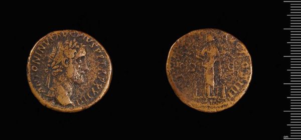 Curator: This object is a Sestertius, likely struck during the reign of Gordian III. Editor: It has a certain gravitas, doesn't it? The patinated bronze and worn edges speak of age and circulation. Curator: Indeed. The obverse presents a profile portrait of Gordian III, surrounded by an inscription identifying him. The reverse depicts a standing figure, likely a personification of a virtue, holding a scepter. Editor: Note how the incuse relief of the emperor's profile contrasts with the raised legend and how the patination obscures the details of the figure on the reverse. Curator: The Sestertius served as a vital tool for imperial propaganda, disseminating the image and authority of the emperor throughout the Roman Empire. Editor: And it is a tangible connection to the past, a fragment of daily life, imbued with symbolic weight. Curator: Yes, a coin like this, a common currency, played a role in the economic and political life of the Roman Empire. Editor: It is a humble yet powerful artifact. I am left contemplating the weight of history pressed into such a small object.