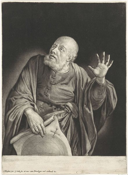 Curator: Before us is Adriaen van Ostade’s etching, “Bakker blaast op een hoorn in een deuropening,” its creation falling somewhere between 1646 and 1900. Immediately, one feels the bleary cacophony. Editor: Cacophony is the precise word; the tight crop amplifying the baker’s raucous declaration. It feels, simultaneously, contained and explosively present. One is immediately aware of gender and class and how they mediate access to sonic space in early modern Europe. Curator: Note how Ostade employs etching to suggest depth and texture. The network of lines defining the baker’s features, his garment, the wooden frame—it’s all masterfully rendered. The window latticework in particular shows command. Editor: That latticework isn't merely decorative; it functions as a grid, further boxing in the subject. Here is an image of Dutch industriousness, the baker framed as a working-class man in an increasingly mercantile society where production became increasingly fragmented and classed. The baker’s horn disrupts this gridlock with what would surely have been noise pollution. Curator: An important point. And consider how the artist's name, elegantly inscribed above the door, becomes another layer of structural containment. His mastery of the burin has created an indelible representation. The light and shadow work wonders! Editor: That light feels mediated through a lens of power. Ostade, as an artist, chooses to represent this baker in this fashion, potentially reinforcing existing stereotypes of the working class as rowdy. To look is to participate in power structures, however unconsciously. What does it mean to consume an image that might solidify social divides? Curator: Perhaps instead, Ostade, capturing the spirited vitality of a common baker, simply reveals the diversity of everyday Dutch life. The subject’s gesture, even beyond class, celebrates humanity's simple, intrinsic pleasures: the act of sounding a horn. Editor: Possibly, yet we can also interpret that pleasure in a range of ways, particularly when contemplating whose pleasure this action caters to or detracts from. It challenges our modern notions of access, volume, and the social responsibilities attributed to public actions. Curator: It prompts reflection, at the very least, indeed. Thank you, truly, for your insight. Editor: It is imperative we continue posing critical inquiries of representation as we interpret this Dutch Golden Age image.