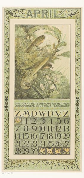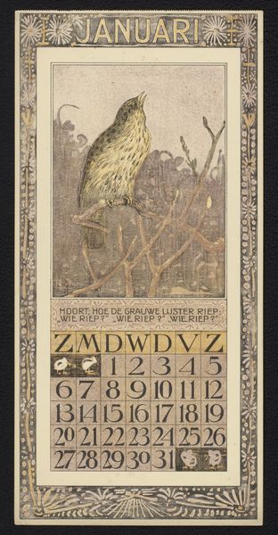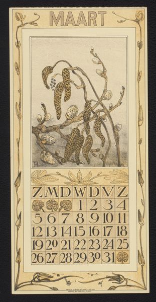 Curator: Oh, I find this delightful. "Kalenderblad voor oktober 1911 met salamanders en paddenstoelen" or, Calendar Sheet for October 1911 with salamanders and mushrooms by Theo van Hoytema. It’s from 1910, done in ink, pen, and print. Editor: My goodness, it's like stumbling upon a fairy ring. There's a strange, muted beauty to it. Sort of melancholic, even, for a calendar. The salamanders look pensive, don't they? As if they're pondering the fleeting nature of October. Curator: Van Hoytema’s calendar designs were incredibly popular. He really understood how to blend functionality with artistic expression and nature's elegance. This particular piece gives us a sense of his strong affinity with Art Nouveau and also symbolism. Note that frame constructed from stylised vegetation. It is not just decoration; it frames the seasonal experience. Editor: Absolutely! It’s a curated snippet of the natural world, neatly organized by days and dates. It's interesting how the composition, while somewhat structured, avoids being overly rigid. The mushrooms are almost playfully placed. This isn't just a calendar; it's a little ecosystem rendered on paper. Curator: His artistic style, rooted in careful observation, often features creatures that were not as visible at that period. In an urbanizing and industrializing country such as The Netherlands, Hoytema invites viewers to really observe what is usually beneath one's notice. The mundane details of the environment becomes worthy of art. Editor: Do you think the choice of salamanders carries some symbolic weight? Perhaps related to change or adaptation, since they’re amphibians, beings of both land and water? Curator: Possibly! Symbolism was quite important at that period. One needs to think how the rising popularity of ecological and biological sciences played a crucial role in his choices. These choices are not random and definitely reflect broader concerns, like scientific insights being available for everyone. Editor: Well, looking at it, I'm struck by how fresh it feels, even now. It has this timeless quality that transcends its practical purpose. Curator: Exactly. Art transcends functionality. This offers both an aesthetic appeal and also highlights an ongoing social concern: to celebrate and conserve what we already have in terms of landscape and nature.