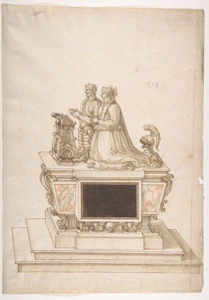 Here is a design for a man's tomb, an ink drawing of unknown origin. Dominating the sketch is a figure kneeling in prayer, a posture laden with historical significance. The act of kneeling, deeply rooted in religious and secular traditions, symbolizes humility, supplication, and reverence. We see it echoed across millennia, from ancient Egyptian depictions of pharaohs kneeling before deities to Christian iconography where saints and sinners alike adopt this posture in moments of profound spiritual encounter. Think of the powerful emotional charge conveyed in countless Renaissance paintings, where kneeling figures embody both piety and vulnerability. Such gestures are not merely aesthetic choices; they tap into our collective consciousness, evoking deep-seated emotions and memories. This drawing captures a moment of intense personal devotion, inviting us to reflect on the universal human experience of seeking solace and meaning in the face of mortality. Note how the symbol of kneeling has undergone a fascinating journey, evolving across cultures while maintaining its core essence of submission and entreaty.