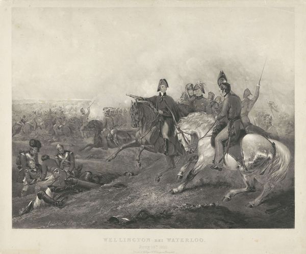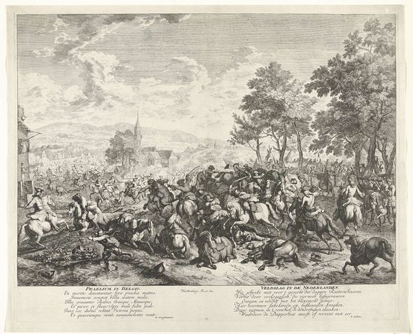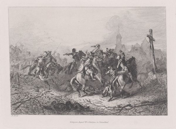Curator: This is "Gevechten tussen Fransen en kozakken bij Deventer, 1813" by Jacob Ernst Marcus. It depicts, as the title suggests, a battle between French and Cossack forces near Deventer, Netherlands, during that tumultuous year. It’s an engraving. Editor: My first impression is a chaotic scene held together by a surprisingly delicate line work. The sky almost seems to press down upon the violent struggle below. The plumes of smoke blend seamlessly into the cloud formations overhead. Curator: Yes, there is definitely a strong sense of Romanticism embedded here, with an emphasis on chaos, perhaps suggesting the sublime power of war and the insignificance of human struggles against larger historical forces. The conflict becomes symbolic. Editor: Exactly. The piece visualizes power struggles on the ground and in the heavens, doesn’t it? Zooming in, I’m struck by how even the figures are being consumed by this haze. But where do you see those Romantic undertones coming from? Curator: Beyond the scale of the event itself, one must consider the time this work was created. 1813 was a time when much of Europe found itself embroiled in these conflicts. Cossack warriors, especially, often became a popular figure. As representatives of this freedom over French imperial authority they appear again and again throughout the artwork of the time, representing a victory over tyranny and authoritarianism, at least in symbolic terms. Editor: So the very figures present speak to ideas of freedom and revolution. Do you think that framing gives license to the clear disbalance of the classes that are visibly portrayed within it? How do you feel that the classism presented at this time plays into the continued glorification of these power struggles. Curator: You make an excellent point about class and how conflict is often depicted. One must consider the fact that most depictions of combat lack ground level depictions of struggle in favor of idealized leaders and victories. In this instance, while not ideal, there is certainly a more nuanced attempt at bringing real world aspects of war to this visual interpretation, Editor: It gives me a great deal to reflect on. I will be viewing this piece and thinking of it for quite some time. Thank you. Curator: Likewise. It has given me a new lens to examine Jacob Ernst Marcus’ work and that of his contemporaries as well.