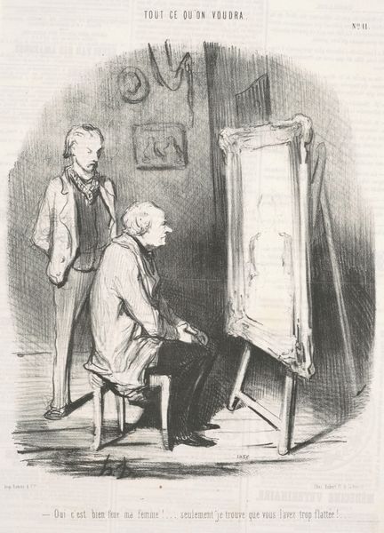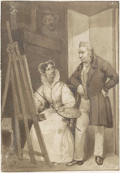 Curator: Let's discuss Cornelis Rog-aar Snellebrand's self-portrait. Created in 1839 using pencil and graphite, it depicts the artist within his studio space. Editor: The immediate feeling is one of quiet concentration. There’s a subdued light, everything rendered in shades of grey, it draws you into this very intimate space. Curator: It’s fascinating to consider this portrait within the context of Romanticism and burgeoning Dutch identity. The lone artist, positioned in his creative space, speaks to the Romantic ideal of the individual, reflecting the social narratives around artistry. Note how he gazes past the easel and almost, it seems, towards a glorious, unseen, perhaps even imagined, horizon. Editor: The objects within the space carry significance too, I think. Those classical busts perched high, almost looking down on him, suggest an awareness of tradition, of the artistic canon. His engagement, not with social change or national fervour but with portraiture in an artist's studio, could be read as an intellectual claim for the importance of painting itself. Curator: Absolutely. There’s a dialogue happening here, not just on the canvas but in the relationship between the artist and the inherited symbols of art history and maybe he is drawing his inspiration from his predecessors or the great artists. How can an artist assert his own unique presence amidst artistic tradition? It asks us to think about an artistic pursuit in this moment and how it has changed or stayed the same. Editor: Also note how his palette rests upon a stack of folios – there's a suggestion of harmony here, linking visual work and written narratives that has been sustained over time and persists to this day. A testament to this visual language? Curator: A language in conversation, undeniably. This portrait invites us to consider these intersectional themes, prompting questions about the artist's role, identity, and creative legacy, all while reminding us to critically investigate the space the artists were working from. Editor: It's a moment suspended. Capturing an artist, contemplating a process. An open visual loop that allows continuous meaning for generations to come.