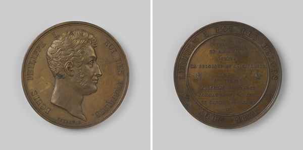 This is a bronze medal created in 1849 by David van der Kellen, commemorating the death of King Willem II. Its circular form, defined by the raised lettering around the edges, presents two distinct sides, each with a unique composition. On one side, we see a profile of the King, his features sharply delineated. The opposite side features an inscription detailing the circumstances of his death. The text is arranged in a structured, almost architectural manner, reflecting the formal conventions of memorial design. Below this, a symbolic image evokes mourning. The medal's material and form invite contemplation on the nature of memory. The medal can be seen as a semiotic object, encoding cultural values related to monarchy, national identity, and remembrance. The use of bronze, a durable material, signifies the lasting impact of the King and the nation's enduring grief. It prompts us to think about how power and emotion intersect in public commemoration.