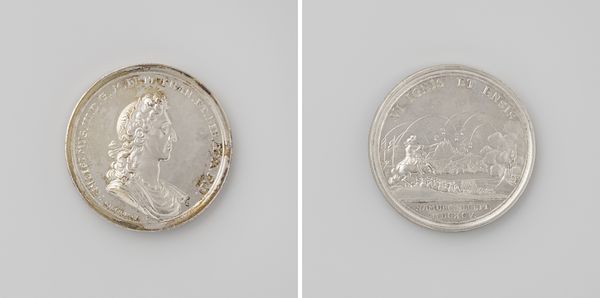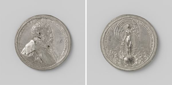 Editor: Here we have a metal relief from 1698 by Jan Smeltzing, titled "Balthasar Bekker, predikant te Amsterdam, door de synode te Alkmaar afgezet." The stark contrast and cool metal feel lend a serious mood. It's intriguing how a story unfolds on such a small scale. What visual elements strike you most in this piece? Curator: The formal composition invites immediate analysis. Observe the circular format—a closed system mirroring the confinement of Bekker’s situation. The starkness is not merely aesthetic, but structural. Note the division: the portrait on one side, allegorical scene on the other, representing the personal and public dimensions of Bekker's conflict. Consider also how the lettering functions; not merely as labels but as compositional elements tightening the conceptual framework. Editor: The allegorical scene is a bit puzzling. How do we decode its message, focusing on its visual language? Curator: Precisely! Semiotics guide our path. The figure, possibly Ecclesia, stands defiant. The broken snake symbolizes defeated falsehoods, and the distant cityscape implies a church in turmoil, and the staff could symbolize authority. But look closer; the flatness of the relief minimizes depth. Is this flatness a symbolic choice? Does it speak to a particular period style, or perhaps a deeper statement about the limitations imposed upon Bekker's world? Editor: I never considered the flatness as a deliberate choice! Seeing these visual cues helps clarify the narrative in a new light. I am seeing new dimensions by just observing what it contains, beyond just knowing. Curator: Precisely. Art invites such formal, rigorous, and enlightening dialogues, wouldn't you agree?