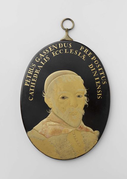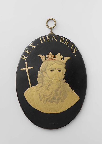 Curator: Here at the Rijksmuseum, we have an engraving dating from between 1775 and 1800 titled "Sigismund I," rendered in metal, and gold. Editor: Ooh, right off the bat, I get this really strong, like...royal decree vibe. It's striking, the stark black background with that almost luminous gold. Very theatrical! Curator: Indeed. This piece aligns with the Baroque aesthetic, and though crafted later, evokes the powerful imagery of historical portraiture intended to project authority. Consider how this portrait contributes to an idea about kingship. Editor: Absolutely. But something about the style, it feels… not quite reverent, almost verging on caricature? Like a king, but viewed through a slightly warped lens. I almost get this… sly smile that maybe only a knowing observer will appreciate. It almost makes me laugh and makes this character that may have been rigid and unknowable for generations, a bit relatable. Curator: It’s an intriguing point. While commissioned art of this kind usually cemented power structures, we see periods where artists inject commentary – sometimes subtle, sometimes not so much. Editor: Maybe it's just me and my wild interpretations! But think about it. Even the way his eyes are portrayed – they’re looking at you like he is judging whether he should let you in on a cosmic joke. It’s all about questioning appearances. Is he noble? Is he kind? I almost don’t care – and just appreciate him as a wise, flawed dude trying to run a nation, like all of us doing our taxes every year. Curator: You highlight a key point – that we each project ourselves onto art, infusing it with our unique experiences. But looking again at the material and era, this work really shows a trend in portraiture during this time – where the intention to project power meets something much more down to earth, a reality that is felt and experienced by ordinary people. Editor: Yeah. Ultimately, it's not just an image, is it? It is the convergence of personal, historical, and maybe, a touch of our own humor looking back. Curator: Exactly. It encourages us to question not just the image of power, but also the lens through which we view history itself.