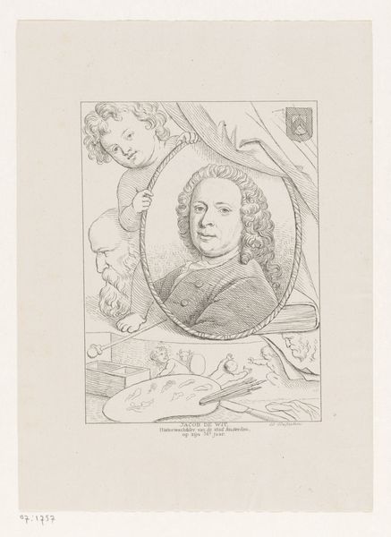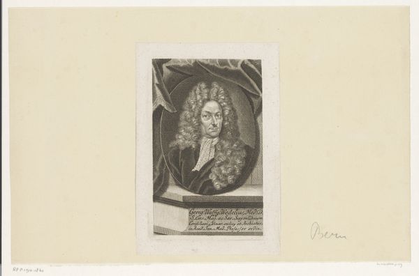 Curator: My first impression is of intricate layers – everything rendered in a classical style that is both precise and lavish. Editor: Indeed. This is a portrait of René François de Beauvau du Rivau, captured between 1722 and 1775 by Georg Friedrich Schmidt. It's an engraving, that favors detail and linearity. Curator: And such detail! Look at the regalia framing his face, the mitre and crosier alluding to his clerical position. Even the books seem to breathe an academic air. The arrangement carries so much semiotic weight, doesn't it? Editor: Absolutely. The portrait seems calculated to project not just individual likeness, but institutional power. It speaks of baroque sensibility tempered by the rational clarity of classicism, notice the controlled use of shadow and line weight. Curator: The oval cartouche enclosing his visage certainly emphasizes a kind of authority and importance. The subject himself, appears calm and confident. A study in controlled emotion befitting his status. One might suggest it projects qualities associated with enlightened leadership of the time. Editor: The balance is indeed interesting; observe how Schmidt utilizes textures to delineate planes. His garments—rich fur against stiff clerical collar—and how this tactility provides cues about identity and even temperament. A fascinating composition of form and surface. Curator: Consider too how this image served as a kind of cultural shorthand, codifying and transmitting not just likeness, but an entire complex web of beliefs and values, that would communicate across different sectors of society at the time, reinforcing both authority and respect. Editor: I was captivated from the beginning by the framing—the ornamental arrangement suggesting prestige and order. It led me to consider the way artistic skill constructs these notions of societal importance through shape, texture, and, certainly, strategic compositional balance. Curator: Examining this engraving, it seems as if we peered into not only a specific figure, but also at how societies create heroes and symbols to transmit particular views. Editor: Yes, this visual exercise also shows how keen observation of structure could, in some measure, reveal a wider cultural structure during the late baroque period.