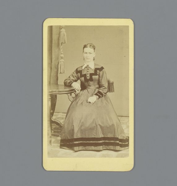 Curator: Looking at this piece by Amédée Denisse, titled "Portret van een zittende vrouw met muts en boek in de hand," a gelatin-silver print dating from 1850 to 1867, what strikes you? Editor: Immediately, I'm drawn to the fabric of the woman's dress. The way the light catches and folds, it speaks to a specific material and the labor involved in its production. Curator: Precisely. And how does that reading impact your broader understanding of the artwork within its socio-historical context? This portrait speaks volumes about gender roles and societal expectations during that time. The woman’s demure posture, her attire, the very fact she is captured with a book—all reflect the prescribed sphere for women in mid-19th century society. The photographic act itself became a way for some women to assert their identities within very strict confines. Editor: Absolutely. I see the book as a critical component. The photograph becomes a document of access to knowledge, and the materials involved, from the paper to the ink, become extensions of the woman's intellectual world, as if education is another layer of textiles. Also, consider the photograph’s materiality—the specific gelatin-silver process—reflects evolving technologies and emerging industrial practices. Each choice—the paper, the chemicals, the printing—speaks to the economic realities underpinning artistic creation. Curator: That's an interesting interpretation of access. Also consider that while photographic technologies may seem democratizing, early portraiture remained relatively exclusive, affordable primarily to middle and upper classes. Therefore, understanding the socioeconomic framework of artistic production, including photography, unveils complexities regarding visibility, power, and representation. The portrait thus offers not just an image of an individual but also invites inquiries concerning the privileges and constraints experienced by women of her status. Editor: I agree. And the scale matters too, doesn’t it? It's an intimate portrait, made for a specific, possibly private, purpose. A treasured object, like her book. Thinking about the physical handling, the consumption... this photograph probably lived a very different life than a painting displayed on a gallery wall. Curator: Exactly, the physicality adds to our perception of the work. Studying this portrait encourages critical interrogation regarding gender, class, and the materiality of art. Editor: Yes, from thread to text, ink to emulsion, it invites a multilayered conversation about representation and social reality.