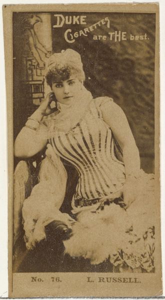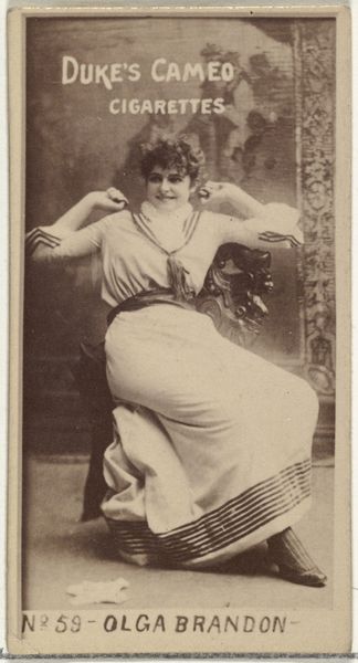 Curator: This is card number 102 from the "Actors and Actresses" series, featuring Vernona Jarbeau, produced by Duke Sons & Co. in the 1880s to promote Cameo Cigarettes. It is currently housed at the Metropolitan Museum of Art. Editor: Oh, my. This gives me the strange sensation of holding a lost secret, like a whispered promise from a time that prized a peculiar theatricality. The sepia tone seems to amplify the sitter’s aura; she is, at once, an intimate yet untouchable figure. Curator: Yes, the sepia toning speaks volumes. It immediately links the image to the era, grounding the actress, Vernona, within a specific historical and cultural context. The gesture of her hand, the cut of her outfit – they each serve as signs pointing towards late 19th-century modes of performance and presentation. Editor: The pointed finger does indeed draw you into her world. A performative beckoning towards a realm unseen by our own eyes. Are we the stage, then? Or something else altogether? Her attire suggests the vaudeville tradition – short dress, elaborately trimmed stockings – that was the popular culture of the day, doesn't it? Curator: Exactly! The commercial nature of the card itself reveals a great deal. These cards functioned as collectibles and trade stimulators, yes, but their use of performers highlights the intertwined relationship between celebrity culture and product endorsement. It's also worth noting that photographs, like these, served as a popular portraiture for public figures during the later parts of the 1800's. Editor: I like that idea, seeing it as an accessible mode of portraiture. And while the cigarettes and her image seem unconnected today, there must be some connection. Did her persona reflect that product’s desired qualities perhaps? Freedom? Audacity? Curator: It's not merely about a superficial association. The image tapped into pre-existing notions of glamour, luxury, and aspiration. This intersection created meaning. And now? It serves as a material cultural record from a distant cultural moment, viewed today from within our own distinct cultural moment, thereby gaining further interpretive complexity through the act of continued observation. Editor: Looking at Vernona, it all seems suddenly connected—the puff of smoke, the promise of entertainment, even the strange confidence in her gaze. So many lost universes within this single fragment! Curator: Indeed. And that fragment carries far more semiotic weight than we might imagine at first glance.
