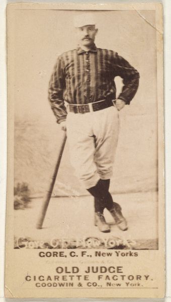 Curator: Looking at this portrait, I feel instantly transported to a dusty, old-timey baseball field. There’s something very human and present in the simplicity of it all, don’t you think? Editor: Indeed! The image, a print, showcases Charlie Reynolds, a catcher for Brooklyn back in 1887. What's fascinating is that these were initially albumen prints produced by Goodwin & Company for Old Judge Cigarettes. Curator: Cigarette cards! Ah, yes, a bit like modern-day trading cards, except attached to a, shall we say, less healthy pastime. Still, this unassuming snapshot captures a compelling picture of athletic life. What strikes me is the man's posture. Not heroic or overly staged, more a gentle acknowledgment of his own physical self. Editor: Precisely. Reynolds is captured in his uniform, holding his bat with a very specific ease. This photograph operates as a cultural artifact. These were made for mass consumption and aimed to link idealized athletic prowess to their brand, embedding a particular image of American masculinity in the collective psyche. Curator: Oh, that’s intriguing! I can see the myth-making aspect, building legends through repetitive imagery. Do you think it's fair to interpret it as straightforward marketing, or something more subtle might be in play? Editor: Well, definitely marketing. But it's more than simple advertising because of its role in codifying the imagery of sport in this era, and what a man was expected to embody. It’s not just about selling cigarettes, but selling an idea of who the consumer might become, a powerful athlete and virile person. Curator: A kind of aspirational archetype! I almost wonder if Reynolds ever envisioned himself as a piece of this larger narrative, forever captured in the hazy amber of an old photograph and now an exhibit in The Met. The banality of its origins and its now refined cultural positioning… there is an irony that warms my heart. Editor: And looking at it now, it can offer a mirror reflecting changing ideas around advertising, masculinity, and sport itself. Seeing how those images function provides vital insight to social change. Curator: Right. Next time I stumble into a ballgame, I’ll remember Charlie and maybe light a symbolic cigarette – maybe a herbal one. Editor: Indeed. It makes one contemplate about which symbols persist in sports today and what these will reveal about us to future audiences.