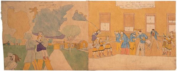 Editor: This is "56 At Jennie Richee. Vivian Girls caught in insane fury of crazy..." by Henry Darger. It’s a mixed-media piece, and right off the bat, the flat figures and slightly unsettling imagery create this dreamlike, kind of unnerving feeling. What captures your attention the most in this work? Curator: You know, it’s that exact blend of the childlike and the chaotic that gets me. It feels like stepping into a half-remembered fairytale gone sideways. I think the long horizontal format, almost like a storyboard, really emphasizes the narrative element; it's like peeking into a secret world. Do you get a sense of story when you look at it? Editor: Absolutely. It’s hard to ignore the feeling that something is unfolding, but I can't quite grasp what. The figures are these young girls, but their blank expressions juxtaposed with the title's "insane fury" hint at something darker. Curator: Right! Darger, he's coming from this outsider art perspective, right? He spent his life creating this massive, sprawling fantasy world filled with these child-like figures embroiled in epic battles. Think of this piece as a small window into his decades-long project, "The Story of the Vivian Girls." He’s tackling themes of innocence, violence, and good versus evil… almost like a personal mythology. What do you think of the juxtaposition of the Vivian girls depicted sometimes nude and other times wearing cute yellow dresses with purple sleeves? Editor: I had not put all these clues together. This feels like looking at something simultaneously precious and unsettling. So much to unpack here. Curator: Exactly! The best art always leaves you with more questions than answers, right?