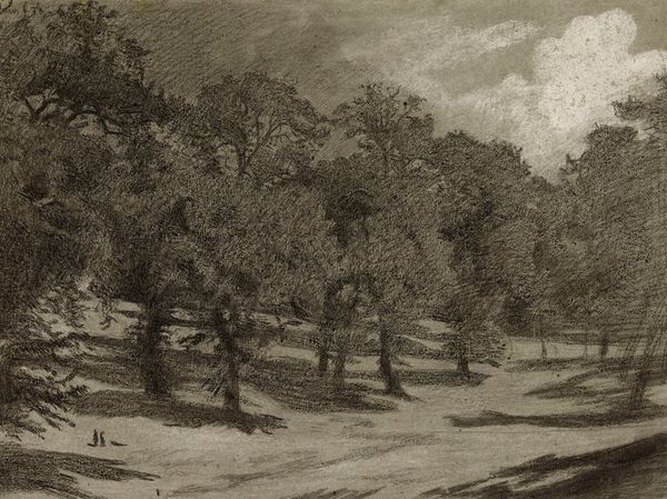 Curator: A brooding quietude pervades this landscape. The artist teases us with hints of light, but the somber hues take precedence. Editor: Indeed, this drawing by Isaac Levitan, titled "Evening. Sunset," from 1895, rendered in charcoal, evokes a strong sense of melancholic reflection. Levitan was a master of the Russian landscape, wasn’t he? I find myself wondering how this imagery spoke to contemporary class dynamics. Curator: Levitan, yes, a central figure in the development of Russian landscape painting. Here, in the twilight's embrace, it's tempting to read this landscape through the lens of contemporary existentialist philosophy. The stark contrasts and desolate beauty might well echo feelings of alienation felt amongst the intelligentsia in this period. Perhaps we see in this work, a parallel to the peasant's isolation, rendered through the bleakness of their material conditions. Editor: The charcoal work expertly uses the textured laid paper to capture light hitting a distant horizon against the sky's roiling patterns and subtle contrasts. What seems simple reveals a sophisticated grasp of depth. This balance, however, seems more than mere formal beauty. The drawing possesses an introspective character, that, in fact, invites these discussions. Curator: Agreed. I appreciate your attention to those structural devices and the formal language—those very deliberate scorings into the surface through charcoal medium—in which a seemingly traditional scene of rural peace speaks instead to wider questions about identity and the individual within Russian society at this historical juncture. It brings forward class, oppression, and the Russian people at the time. It's an unsettling picture, subtly disrupting our comfort with traditional landscape art. Editor: Absolutely. While admiring its technical qualities—the expert use of the limited palette, the atmospheric perspective created with those gestural marks—one cannot ignore that haunting silence that permeates the whole image. In its grayscale restraint and quiet intensity, we find a convergence of form and feeling, an equilibrium achieved by this great master, Levitan. Curator: Yes, a powerful visual metaphor for social and personal anxieties bubbling beneath the surface of late 19th-century Russia. Editor: And an invitation for us to consider what silence might reveal if we give it our attention.