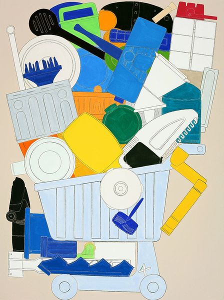 Alfio Giuffrida’s "Hängende Pflanzen Exp5," presents a collection of items organized into an interconnected network of shapes. Giuffrida, born in 1953, developed a visual language that touches on ideas of order, structure, and the relationships between objects. This piece uses industrial colors to depict a collection of everyday objects, each rendered with meticulous care and arranged in an almost scientific grid. Giuffrida explores how we categorize and assign value to the objects that surround us, highlighting the systems we create to understand and control our environment. This creates a tension between the familiar and the abstract, inviting us to reflect on the role of objects in shaping our identities and experiences. Ultimately, the artwork prompts us to consider how we create meaning through the arrangement and interpretation of our surroundings. It turns the personal act of observation into a shared exploration of culture and self.