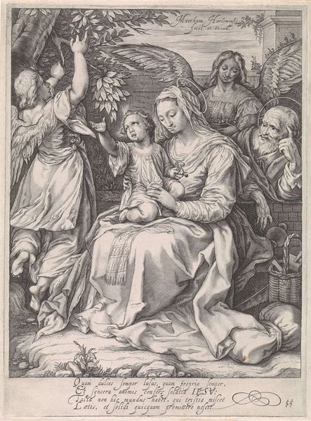 This engraving, rendered by Nicolas Beatrizet, presents the Holy Family alongside the infant John the Baptist. The figures, arranged beneath a sheltering tree, exude a tender intimacy, a motif that resonates through centuries of Christian art. Consider the Christ Child’s gesture, reaching out to John. This motif echoes in countless images across time, each instance carrying the weight of its predecessors. The shared embrace is reminiscent of classical depictions of Eros and Psyche, symbolizing love and the soul's journey. Here, it transforms into a symbol of divine connection and foreshadows John's role as the harbinger of Christ. Observe the Virgin Mary’s gaze, a melancholic downward glance. This gesture, reminiscent of ancient depictions of grief-stricken goddesses, invites us to contemplate the sorrows she anticipates. It speaks to the profound emotional and psychological depths embedded in this image, engaging us on a subconscious level, reminding us of the cyclical nature of sorrow and hope.