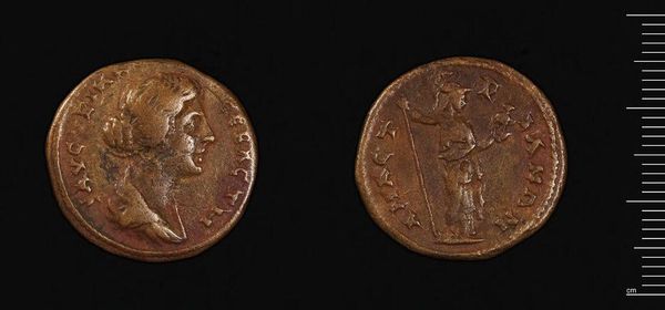 Curator: Here we have a sestertius, an ancient Roman coin, of Faustina II, currently held in the Harvard Art Museums. The coin's patinated surface gives it a lovely, aged character. Editor: It looks worn, doesn't it? A little roughened by time, but weighty, solid. I imagine the hands it passed through, the exchanges it facilitated. Curator: Indeed. The portrait on one side captures Faustina’s profile, while the other depicts a standing figure, likely a symbolic representation of abundance or virtue. Editor: It’s interesting how these coins served as propaganda, subtly reinforcing the power and image of the ruling family through idealized depictions and symbolic imagery. Curator: Precisely, the coin’s design and material speak to the Roman Empire's sophisticated administrative and artistic systems. Editor: Seeing an object like this, one is made aware of the stories of those whose likeness was emblazoned upon them and the populations they ruled. Curator: A poignant reminder that even small artifacts can hold volumes of history and artistic intent. Editor: Yes, it grounds the grand narratives, doesn't it?