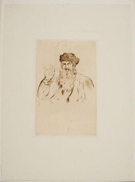 Editor: Manet’s etching, "The Smoker," a small work, captures a bearded man with a pipe. It feels like a fleeting glimpse, a momentary pause. What layers of meaning do you find in this understated image? Curator: The pipe, beyond its immediate function, becomes a potent symbol. In 19th-century art, smoking often represented leisure, contemplation, and even rebellion. Think of its association with bohemian circles; how does that cultural memory resonate here? Editor: It's interesting to consider it a symbol of rebellion. I hadn't thought of that. Curator: Manet gives us a face, but it’s also more than just a face: it’s a meditation on a type, a cultural identity preserved in a moment. Consider the weight of symbols across generations, and what we, today, project upon this image. Editor: So, it's a portrait, but also a cultural artifact, speaking across time. Curator: Precisely. It encourages us to examine the enduring power of images and the stories they carry.