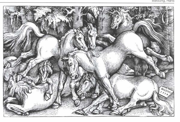 Editor: So this is Hans Baldung’s “A Study of Unicorn,” created in 1544 using engraving. I'm immediately struck by the animal’s strange, almost awkward, pose. It's like it’s caught mid-prance, but stiff. How would you interpret this piece? Curator: It's interesting you point that out. The "awkwardness" might be a reflection of the evolving role of the unicorn within the political and social imagination of the time. Think about the cultural function of prints like these – they weren't just pretty pictures. They were tools for disseminating ideas and solidifying power structures. How does seeing the unicorn, usually a symbol of purity and grace, in this slightly ungainly way challenge or reinforce existing beliefs about it? Editor: I suppose if unicorns were largely symbolic of royalty and nobility, as I've read, maybe showing it this way makes the animal—and those associated with it—more relatable? More human? Curator: Precisely. Baldung was working during a period of religious and social upheaval. The Protestant Reformation was challenging traditional sources of authority. Perhaps portraying the unicorn with a touch of imperfection, through form and pose, mirrors the questioning of established ideals. Who were the audiences consuming prints like this, and how might the portrayal of a mythical creature influence their perceptions of authority and the natural order? Editor: So the context shifts the symbolic weight of the image, not just the image itself. Fascinating. I also see it dated "1544." Curator: Yes, dates on art pieces are critical! Consider what political climate the artist would have lived under at the time, and if they took sides. Editor: That makes so much sense. I initially saw it as just a slightly odd depiction of a unicorn, but seeing it in the light of social and religious context makes it far more engaging. Thanks for broadening my view. Curator: Likewise, this conversation demonstrates how contextualizing art brings it to life. By questioning why a unicorn is shown in such a manner during that era, it’s no longer a simple drawing. It reflects complex power dynamics, religious questions, and emerging social trends.